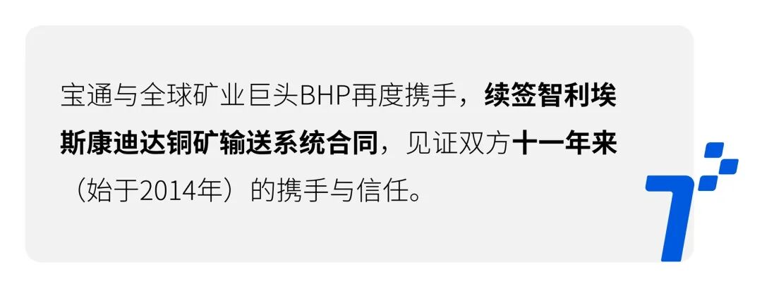 自2014年以来,宝通已为BHP全球矿山提供500+公里高性能输送带,覆盖智利铜矿及澳洲铁矿等多类矿山。2022年,宝通与必和必拓斯宾塞铜矿合作,共同推出全球首条“碳中和输送带”,并被写入必和必拓南美ESG年报。当前双方合作正全面迈向智能化:在埃斯康迪达矿”先驱“项目中,宝通正部署巡检机器人、AI自动纠偏、X光数字扫描、智能测厚等技术,构建实时监测与预警体系,助力矿山实现更安全、高效、绿色的运营。
