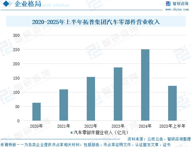宁波拓普集团股份有限公司主营业务为汽车零部件的研发、生产及销售,主要产品包括汽车NVH减震系统、内外饰系统、轻量化车身、智能座舱部件、热管理系统、底盘系统、空气悬架系统、智能驾驶系统共八大业务板块,主要客户包括国际国内智能电动车企和传统OEM车企等。另外,成立电驱事业部切入具身智能机器人业务是公司的一个重要战略举措。具身智能机器人是一个具有广阔发展前景的领域,拓展机器人业务,为公司打造新的增长曲线。公司奉行为客户创造价值的经营理念,坚持研发与创新,推进全球布局,提升综合竞争力,成为让整车厂更加信任的合作伙伴。数据显示,2025年上半年,拓普集团汽车零部件营业收入为12.77亿元,同比增长6.14%。