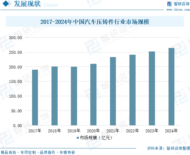 汽车压铸件行业是指利用压铸成型工艺,将铝、锌、镁等合金材料在高压下注入精密模具,制造汽车用金属零部件的产业,产品广泛用于发动机、变速箱、车身结构及“三电”系统等关键部位。汽车压铸件行业的发展得益于汽车工业特别是新能源汽车的快速崛起,轻量化、节能减排需求推动铝合金等轻质合金压铸件应用持续扩大,同时压铸工艺从低压、高压到真空压铸不断升级,提升了零件精度和性能。目前,中国已成为全球压铸件主要生产与消费国,伴随汽车产业整体繁荣,行业实现稳定增长,企业的技术研发与配套能力日益增强,产品结构不断向高端化、集成化方向迈进。据统计,2017-2024年中国汽车压铸件行业市场规模从189.88亿元增长至264.29亿元,年复合增长率为4.84%。未来,汽车压铸件行业将朝着精密化、轻量化、绿色化及总成化方向深化发展,持续满足汽车电动化、智能化对高性能压铸件的需求。