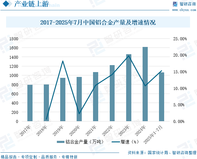 汽车压铸件的原材料种类较为丰富,其中,铝合金是市场上广泛采用的主要材料。铝合金压铸件因其轻量化特性,能够有效提高汽车的燃油效率,同时具有良好的可加工性,可以制造出各种复杂形状的汽车零部件。这种材料还具有出色的耐腐蚀性和优良的导热性能,特别适合用于需要散热的部件。作为现代工业的重要组成部分,铝合金凭借其高强度、耐腐蚀、延展性好、易加工等优异性能,在航空航天、交通运输、电子电器、建筑等多个领域得到了广泛应用。随着全球对节能减排和轻量化需求的增长,铝合金行业迎来了前所未有的发展机遇。特别是在新能源汽车、绿色建筑等新兴领域,铝合金的需求增长尤为显著。国家统计局数据显示,2017-2024年中国铝合金产量从792.2万吨增长至1614.1万吨,年复合增长率为10.7%。2025年1-7月,中国铝合金产量为1062.8万吨,同比增长15.28%。未来,随着铝合金产量的持续提升,汽车压铸件行业也将迎来进一步增长。