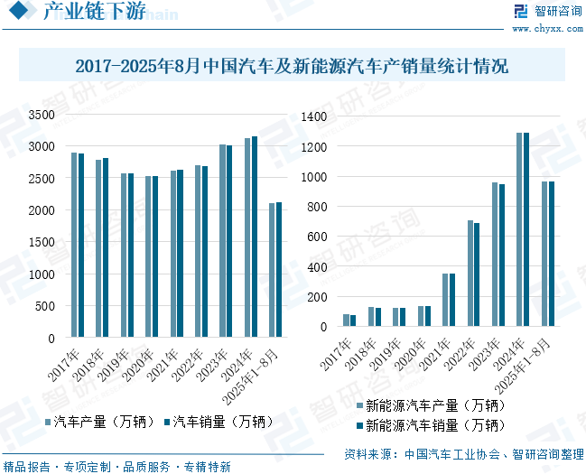 汽车压铸件是采用特定的压铸工艺,将熔融的金属在高压下注入模具内,待其冷却凝固后形成的金属零件。这些零件广泛应用于汽车发动机、底盘、车身和电器设备等关键部位。汽车产业是我国国民经济的重要支柱产业,自21世纪以来进入快速发展阶段。2007年产量达888.24万辆,2008年突破千万大关,产销规模位居全球第三。近年来,国家推出包括汽车以旧换新在内的多项扶持政策,各地也积极开展形式多样的促消费活动,显著拉动了汽车消费。与此同时,随着中国经济持续发展和居民收入水平不断提高,汽车消费需求稳步增长,庞大的国内市场为汽车产量提升提供了坚实基础。中国汽车工业协会数据显示,2017-2024年期间,中国汽车产量从2901.54万辆增长至3128.2万辆,年复合增长率为1.08%;汽车销量从2887.89万辆增长至3143.6万辆,年复合增长率为1.22%。2025年1-8月,中国汽车产销量分别为2105.1万辆和2112.8万辆,同比分别增长12.7%和12.6%。从新能源汽车产销量来看,2017-2024年期间,中国新能源汽车产量从79.4万辆增长至1288.8万辆,年复合增长率为48.91%;销量从77.7万辆增长至1286.6万辆,年复合增长率达49.33%。2025年1-8月,中国新能源汽车产销量分别为962.5万辆和962万辆,同比分别增长37.3%和36.7%。随着汽车产销量的持续增长,汽车压铸件行业也将迎来更广阔的发展空间。