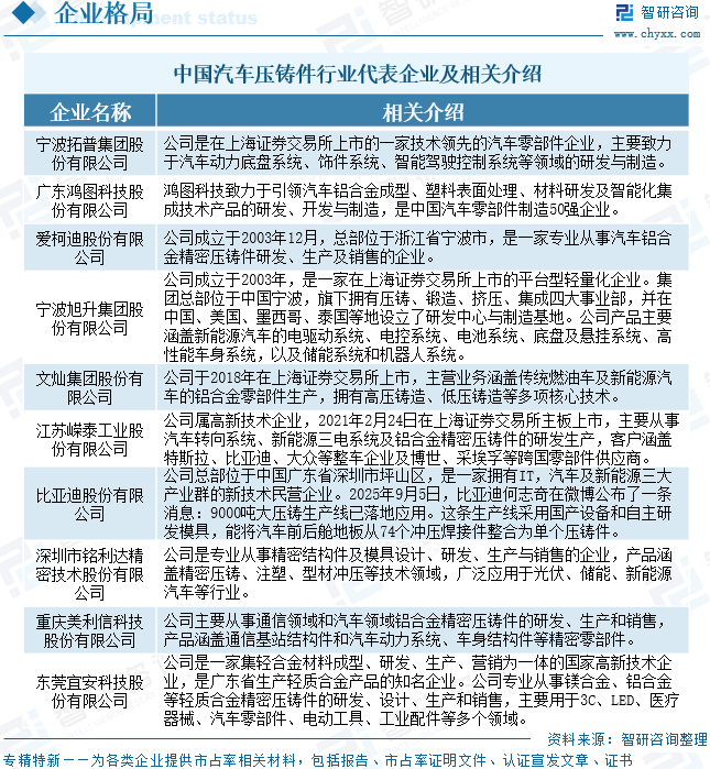 汽车压铸件行业企业格局和重点企业分析