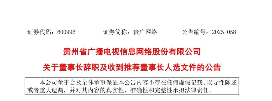 11月24日,贵广网络(维权)发布《关于董事长辞职及收到推荐董事长人选文件的公告》。
