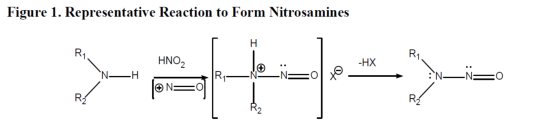 N-亚硝胺类化合物是国际癌症研究机构认定的2A类致癌物[1]。这类物质能够直接损伤细胞DNA,诱发基因突变,进而促进肿瘤形成。由于其较强的毒性,ICH M7将之列为“关注阵列”物质[2]。在人用药品中,处方、工艺、包材、生产和贮藏环境等因素均可能导致N-亚硝胺类杂质的产生,原料药中出现N-亚硝胺类化合物与原料药自身制备过程,以及溶剂和设备中产生了直接或间接的交叉污染,还有在储存过程中发生了化学降解反应等可能原因有关。