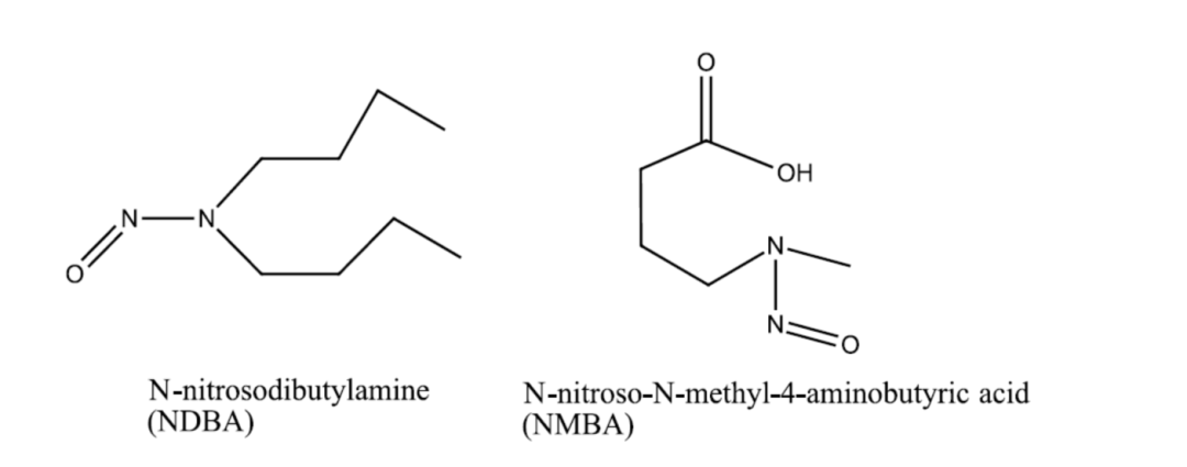 根据化学结构是否与原料药有关,美国FDA指南将N-亚硝胺类杂质分为两种:小分子N-亚硝胺和NDSRI(与原料药化学结构有关的N-亚硝胺类)(见下图1-3)[3]。美国FDA、欧洲EMA均发布了一系列的关于N-亚硝胺类基因毒性杂质控制策略的指导原则,并提供了一些药物中已验证过的检测方法,这些方法可以用于其它药物中N-亚硝胺类基因毒性杂质方法开发的参考[4]。中国药监局也推出了化学药物中亚硝胺类杂质研究技术指导原则(试行)[5]。