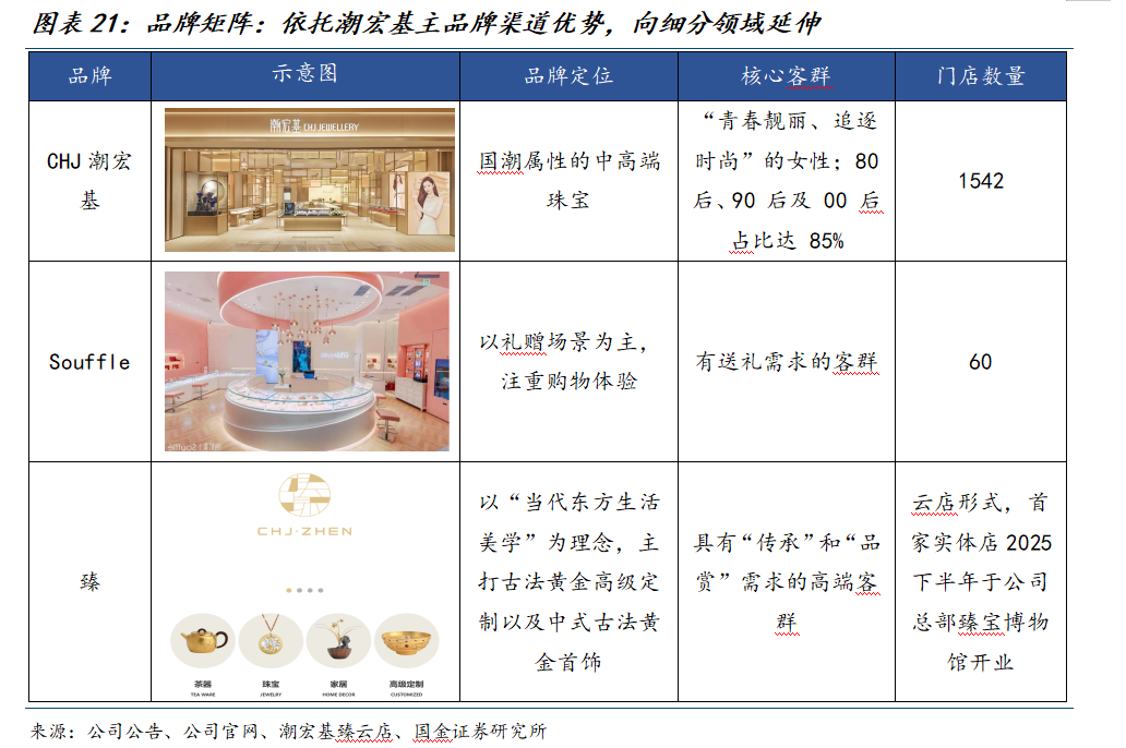 潮宏基目前有主品牌CHJ潮宏基、子品牌souffle以及高端品牌臻,差异化品牌定位锚定不同类型客群。