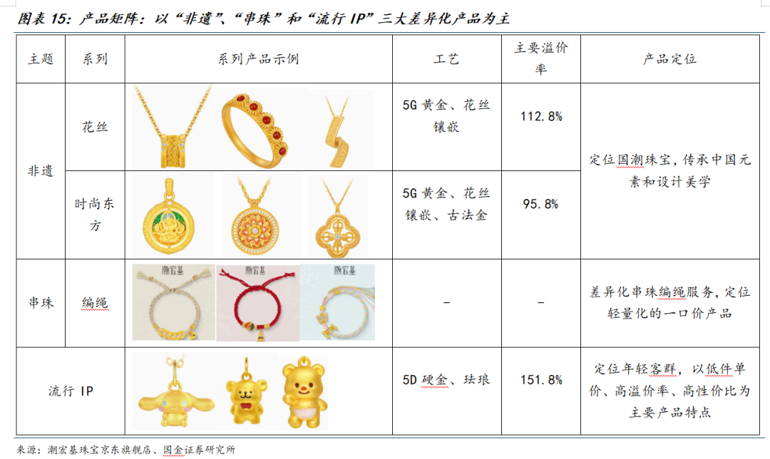 主品牌: CHJ 潮宏基主打东方文化元素与现代时尚相结合的原创产品,不断丰富黄金饰品品类。作为全品类珠宝品牌,潮宏基近年来不断丰富黄金品类,推出黄金联名 IP首饰、创意黄金串珠等产品,精准捕捉年轻消费者的审美偏好,以“年轻、时尚、会玩”的品牌形象深入人心。古法金方面,近年推出的“凤影”“鼓韵”“京粹”“祥扣”“善缘”“花丝糖果”“花丝风雨桥”“花丝云起”“花丝如意”等系列产品,凭借独特的中国元素和设计美学,深受市场青睐。