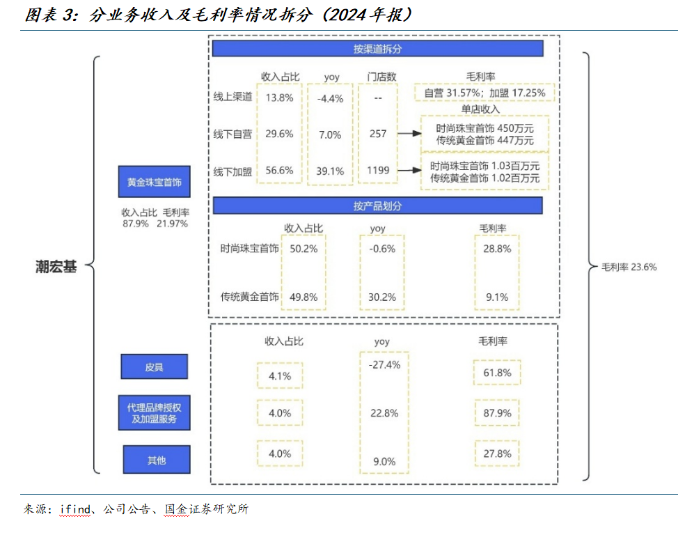 潮宏基主营业务以珠宝业务为主,线下加盟业务贡献收入增量。2024年公司黄金珠宝首饰营收占比为87.9%。从渠道模式来看,公司以自营和加盟模式为主,截止2025年上半年共有门店数1542家,加盟店1340家。从产品类型来看,2024年公司传统黄金首饰产品快速增长30.2%,目前时尚珠宝首饰(K金品类)和传统黄金首饰营收贡献基本持平,其中K金产品一直以来都以一口价定价为主,设计、工艺溢价带动下毛利率更高。