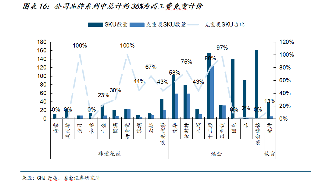 “镶嵌”、“串珠”、“一口价”是手段而非目的,素金工费的高溢价能力才是品牌认可度的本质验证。根据公司潮宏基品牌云店数据统计,公司核心品牌系列中,除了IP串珠系列均为一口价定价外,花丝/臻金/故宫系列分别约有38%/36%/3%为克重计价,对其中代表性高销量产品统计可得克重工费在85-433元/克,已达到高定级别水平。明确的高工费仍取得消费者青睐,是公司设计及品牌能力的强力证明。