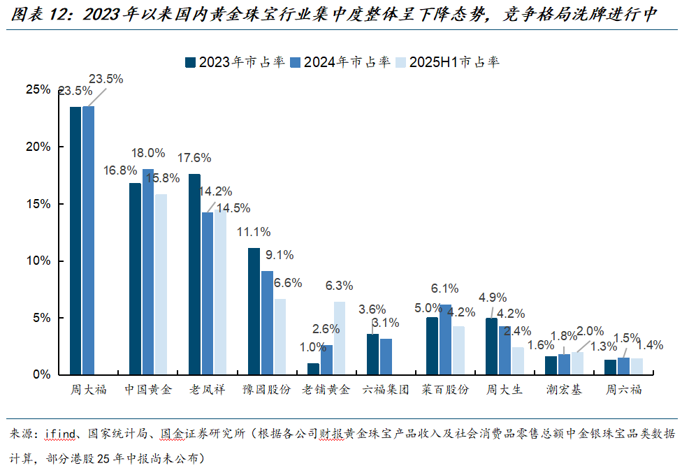 那些通过工艺创新、供应链优化和品牌生态构建护城河的企业,有望率先完成从“渠道型”向“产品型”品牌的转型,在行业洗牌中抢占先机。从市占率变化来看,2025H1前10大珠宝企业市占率相较于2024年整体呈集中度下降态势,其中古法金龙头老铺黄金市占率快速提升,积极进行产品升级迭代的潮宏基市占率逐步提升,2023至25H1分别为1.6%/1.8%/2.0%。