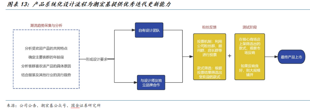 公司具备成熟的研发设计流程与团队配置,支撑快速产品迭代。公司的研发团队主要分为两个层次,一是自有设计队伍,主要负责潮流化、商业化的款式设计;二是通过与全球知名设计师及品牌合作推出标志性系列产品。潮宏基经过多年的设计业务发展,已经形成从潮流捕捉到新品上市的系统化的设计流程,高效推新打下坚实基础。