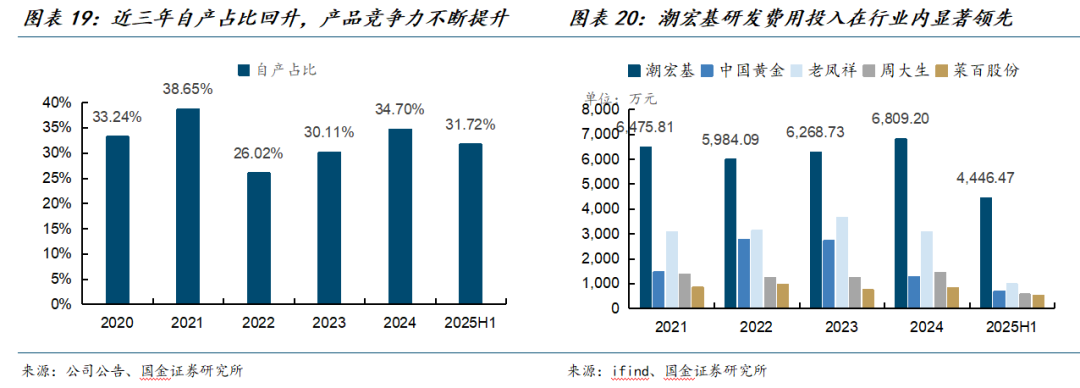 优秀的原创设计产品带动公司自产比例逐步提升,进一步拉开品牌与普货差距。公司研发投入水平近4年来始终位居行业首位,且逐年增加,不断探索工艺创新。目前公司自产主要为素金及镶嵌类产品,这些产品通常设计较为复杂,对工艺要求较高,自有工厂能够更好地把控生产过程,保证产品的质量和设计的精准呈现。2022年公司自产比例26.01%,2025H1年自产占比达到34.7%,充分体现公司原创设计的市场接受度逐步提升。