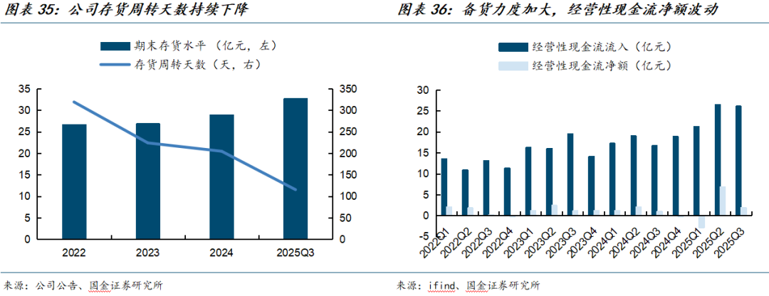 公司加盟规模不断扩张,带动存货周转天数下降。截止2025年第三季度,潮宏基期末存货为32.8亿元,较期初增加14.8%。受24下半年至今销售表现强劲及库存管理水平提升影响,存货周转天数持续下降,2025Q3降至115.26天,为历史低位。