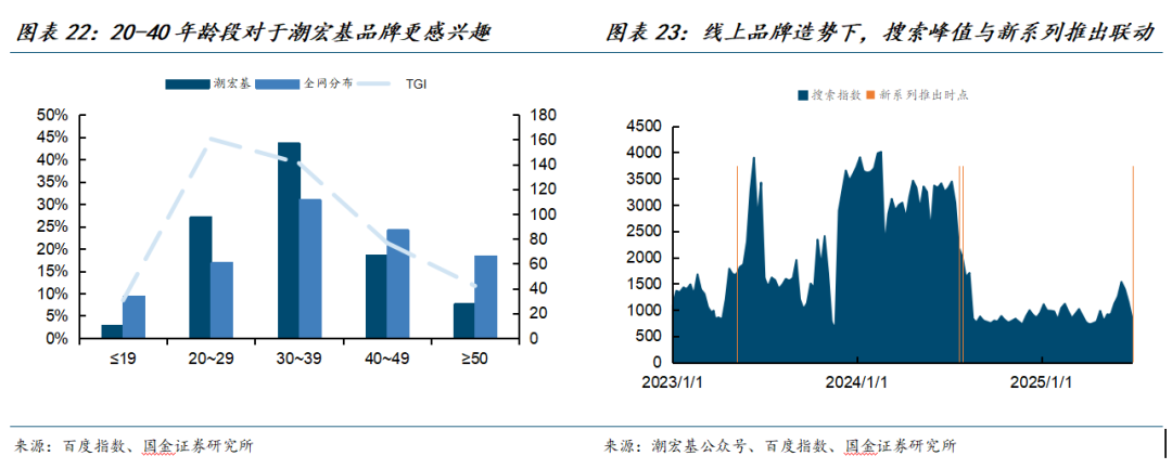 公司客群中80/90/00后占比达85%,对一口价新品接受度高,线上化营销推动产品快速破圈。从百度搜索指数来看,年龄段在20-40的群体的TGI指数大于100,表示该群体在该特征上的表现强于平均水平。