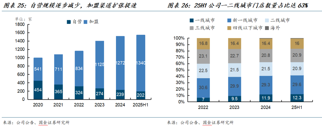 加盟商赚钱效应显著,华中、华北开店拓展空间广阔。截至25H1公司门店数达1542家,其中华东674家。