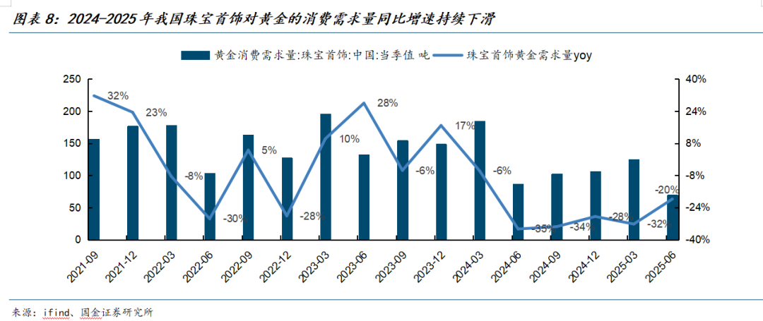 从量价拆分角度来看,我国珠宝首饰对黄金的需求量持续下滑,意味着行业零售额回暖主要由价格驱动。2025年Q1-Q2我国珠宝首饰黄金消费需求量分别同比-32%/-20%。