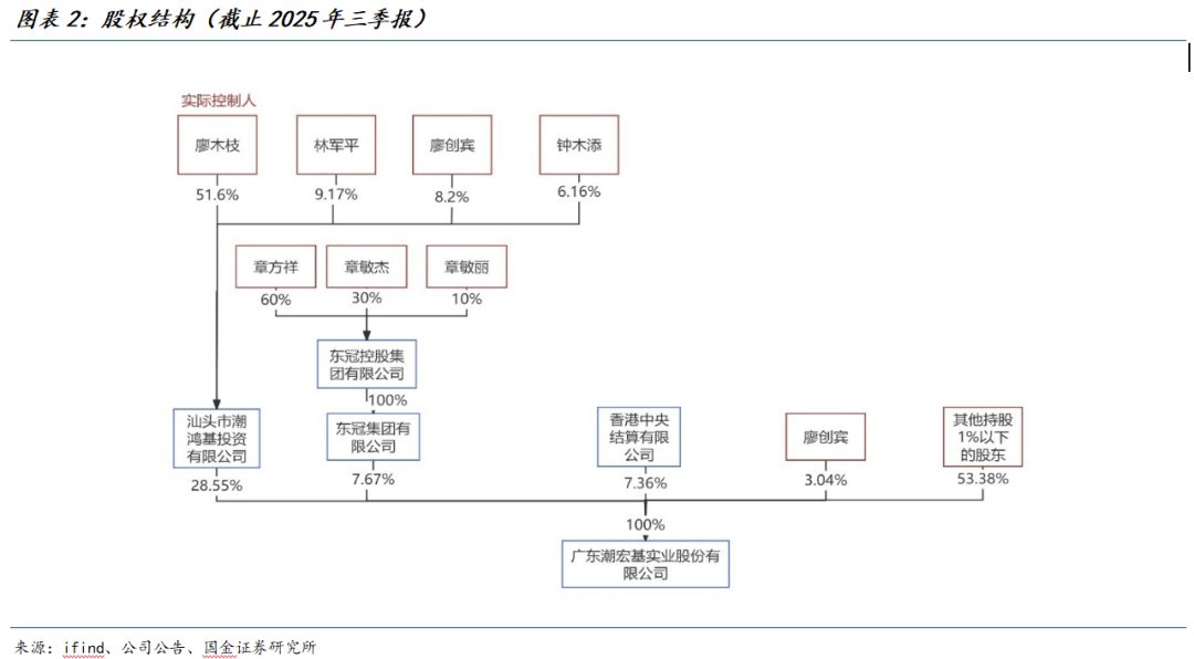 廖木枝家族通过直接及间接持股的方式实现对公司的控制,治理结构较为稳定。截至2025年9月30日,公司前十大股东共持有总流通股股数的51.36%,其中汕头市潮鸿基投资有限公司为大股东,持股比例为28.56%;东冠集团持股7.67%,为第二大股东;实际控制人为廖木枝,现任公司董事、汕头市潮鸿基投资有限公司董事长,直接或间接持有潮宏基实业股份有限公司17.77%股份。