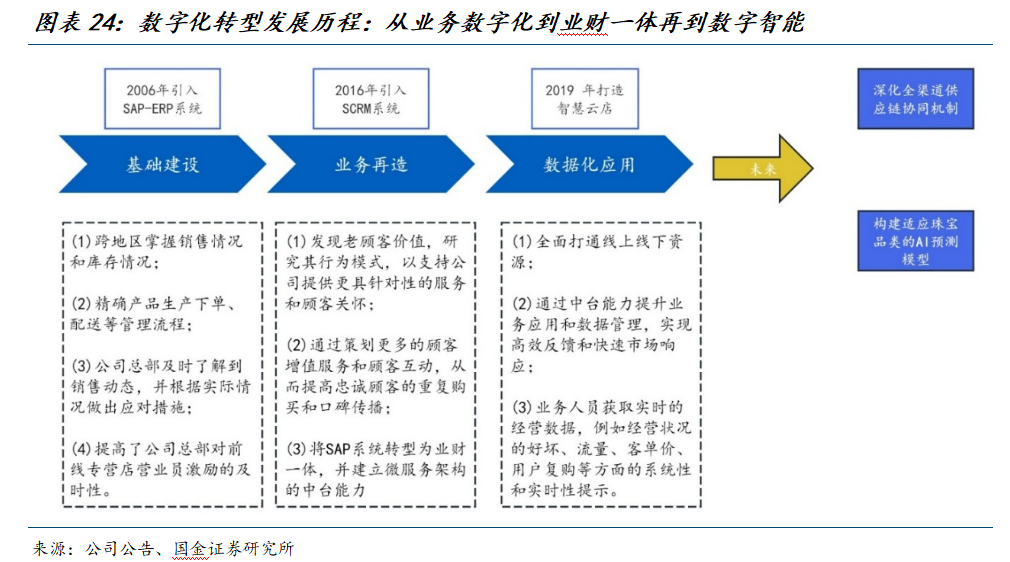 建设全渠道用户生态系统,助力渠道扩张保质保量。潮宏基作为国内第一家使用SAP-ERP系统的珠宝企业,始终注重信息化在企业管理的应用,2016年引入SCRM(社会客户关系管理系统),分析用户行为数据,并与百盛软件合作建设数据中台项目。在2019H2,潮宏基宣布建立智慧云店项目,快速在2020年初实现千店千云店的智慧云店应用,不再让加盟店单打独斗,在后台对每个店的营销数据进行实时分析,抓住消费者的动向,并给出后续调整策略,并以智慧门店项目为抓点,借助各类社交传播平台,全年私域营销不间断、直播带货常态化,实现品牌快速传播、门店引流及裂变销售,快速改善终端零售业绩。同时也将推进产品设计、生产、库存、配送的全渠道供应链智慧化建设,促进公司经营管理的科学化和智能化。