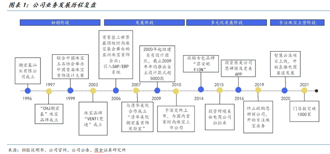 初创阶段,坚持押注珠宝原创设计,奠定公司时尚珠宝基因。公司1996年于广东汕头成立。1997年注册CHJ潮宏基品牌。1999年,潮宏基拿出一年的净利润联合中国珠宝玉石协会举办中国首届珠宝首饰设计大赛,在珠宝首饰行业产生广泛的影响,推动了整个中国珠宝首饰设计迈向一个新的台阶。