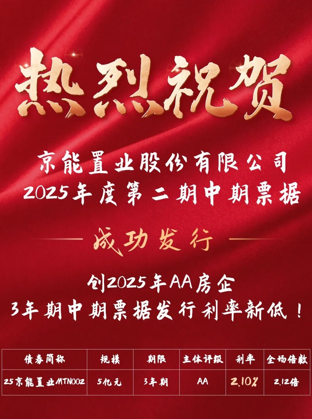 本次中期票据注册额度为10亿元,其中,本期发行额度5亿元,期限3年,票面利率2.10%,认购倍数2.12倍,利率创2025年AA房企三年期中期票据最低。