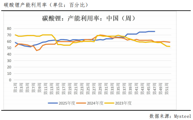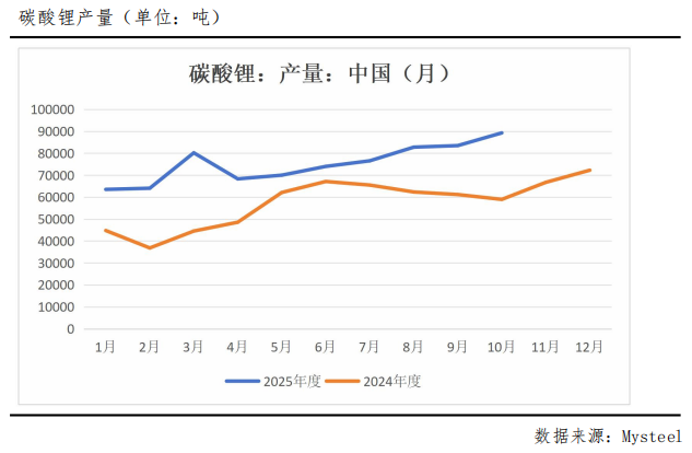 当前锂盐行业整体保持高开工率运行,产能利用率已超过75%,处于近三年来的绝对高位,碳酸锂产量持续处于较高水平。据Mysteel最新统计数据显示,截至11月21日当周,碳酸锂产能利用率为75.34%,虽然环比持平,但同比仍显著提升16.34个百分点;10月份碳酸锂产量录得89290吨,环比增加5790吨,增幅6.93%,同比增加30320吨,大幅增长51.42%。基于当前持续高位的产能利用率判断,预计11月碳酸锂产量仍将延续增长态势。此外,宁德时代枧下窝矿区复产预期逐步升温,若其顺利复产,将进一步加剧供应端压力,碳酸锂价格持续面临来自供给端的压力。