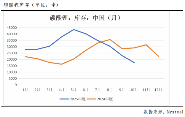 尽管产量呈现增长态势,但产能利用率已逐步趋于平稳,与此同时,受持续强劲的需求拉动,碳酸锂库存急剧下滑,市场已步入明确的去库存阶段。据Mysteel最新统计数据显示,截至10月31日,国内锂盐厂碳酸锂库存为17480吨,环比减少5440吨,降幅高达23.73%,同比亦减少11530吨,大幅下降39.74%。目前碳酸锂库存已处于历史同期绝对低位,为价格形成有效支撑,不过,结合前文对供需基本面的分析,预计后续去库幅度可能收窄,去库节奏将逐步放缓。