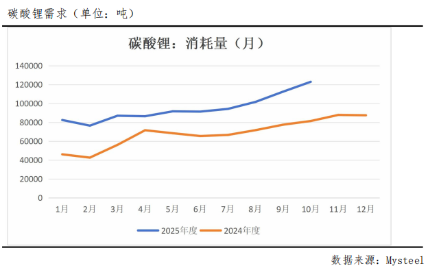 据Mysteel最新统计数据显示,10月份碳酸锂消耗量录得122950吨,实现环比与同比双增长,其中环比增加10454吨,增幅达9.29%;同比增加41604吨,增长高达51.14%。从需求结构来看,动力电池领域订单充裕,下游排产持续处于高位,储能市场需求亦持续超预期表现,两者共同构成了推动碳酸锂需求增长的“双引擎”,需求端已成为本轮碳酸锂价格上涨的核心驱动因素,在政策面对新能源产业持续支持的背景下,预计明年碳酸锂消耗量整体仍将保持稳步增长。值得注意的是,从季节性规律来看,每年12月至次年2月期间,碳酸锂消耗量往往呈现逐步回落态势,短中期内需求走弱可能使价格上行动能阶段性受限。