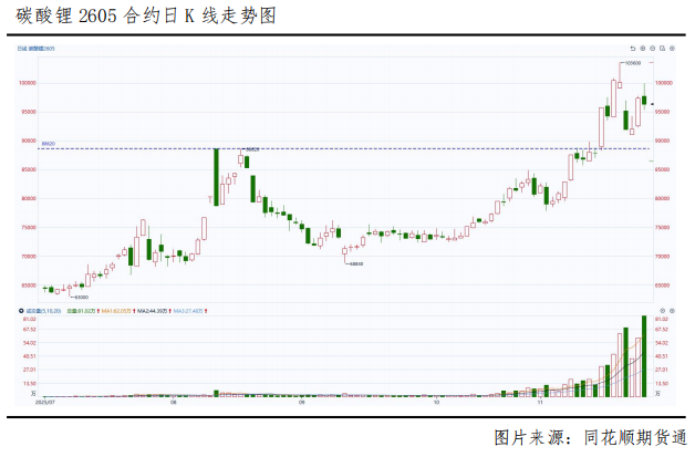 11月26日,碳酸锂主力合约呈现先扬后抑走势,日内成交量显著放大,同时持仓量增加47831手。截至收盘,碳酸锂2605合约报收96340元/吨,较前一交易日结算价上涨1380元/吨,涨幅1.45%。尽管当日录得上涨,但盘面在反弹过程中明显遇阻。是何因素制约其进一步上行?短期是否仍存回调压力?
