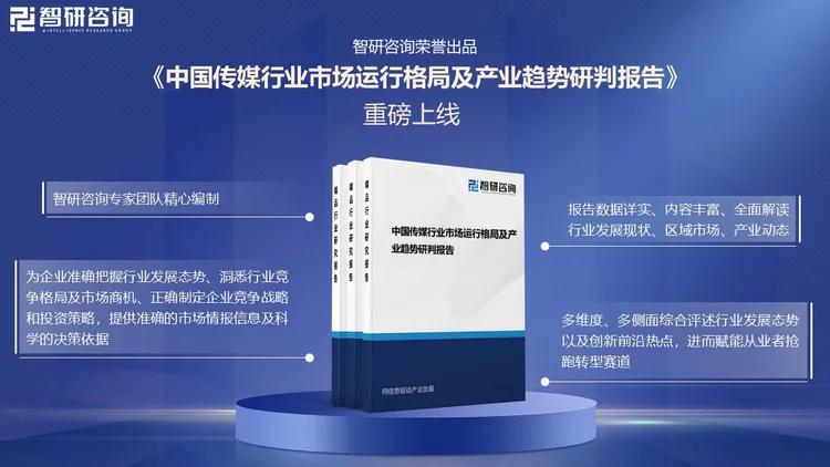 由智研咨询专家团队精心编制的《中国传媒行业市场运行格局及产业趋势研判报告》(以下简称《报告》)重磅发布,《报告》旨在从国家经济及产业发展的战略入手,分析传媒行业未来的市场走向,挖掘传媒行业的发展潜力,预测传媒行业的发展前景,助力传媒行业的高质量发展。