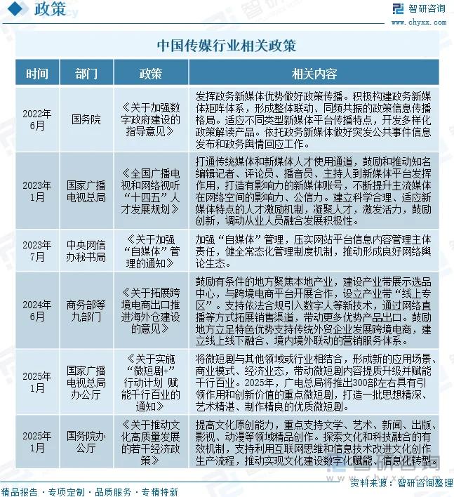近年来,传媒行业转型发展受到政策的重视,相关政策主要以规范类为主。例如,2023年1月,国家广播电视总局印发《全国广播电视和网络视听“十四五”人才发展规划》,打通传统媒体和新媒体人才使用通道,鼓励和推动知名编辑记者、评论员、播音员、主持人到新媒体平台发挥作用,打造有影响力的新媒体账号,不断提升主流媒体在网络空间的影响力、公信力。建立科学合理、适应新媒体特点的人才激励机制,凝聚人才,激发活力,鼓励创新,调动从业人员融合发展积极性。2025年1月,国务院办公厅印发《关于推动文化高质量发展的若干经济政策》,提高文化原创能力,重点支持文学、艺术、新闻、出版、影视、动漫等领域精品创作。探索文化和科技融合的有效机制,支持利用互联网思维和信息技术改进文化创作生产流程,推动实现文化建设数字化赋能、信息化转型。