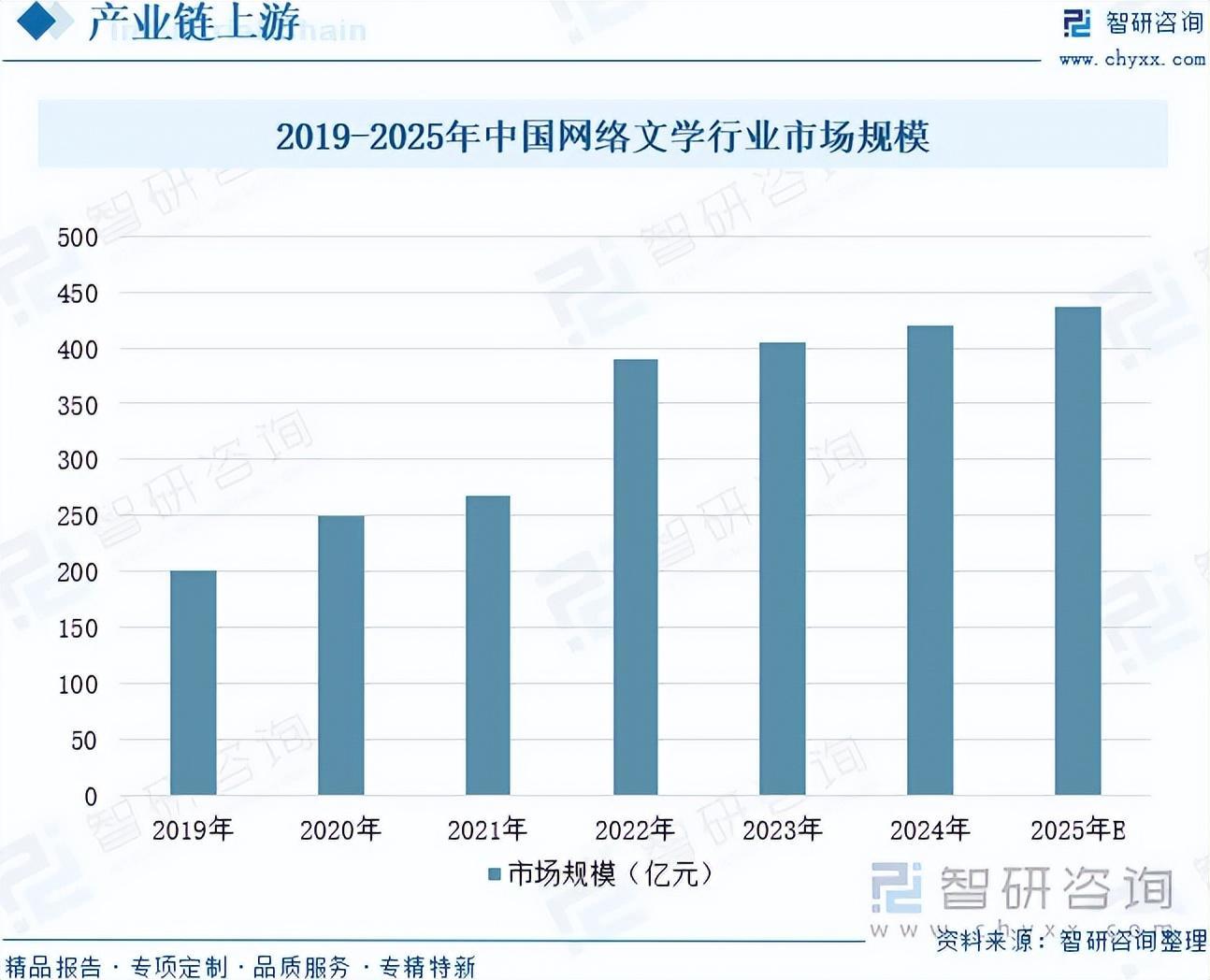 网络文学作为伴随互联网技术发展而兴起的文学形态,是传媒产业上游内容生态的重要组成部分。它以数字创作为核心,为影视、动漫、游戏等中下游产业持续输送故事内核与IP资源,成为传媒内容体系的重要源头。当前,传媒行业上游内容生产虽整体呈现分散特征,但随着优质IP的加速沉淀和AIGC技术对创作效率与叙事能力的提升,上游IP的产业化价值正持续深化与释放。这一趋势也推动网络文学行业规模稳步增长,数据显示,中国网络文学行业市场规模从2019年的201.7亿元增长至2024年的419.9亿元,年复合增长率为15.79%。预计2025年中国网络文学行业市场规模将增长至436.1亿元。IP生态链工业能力提升,网络文学开发周期系统性缩短,行业正式迈入形式迭代、路径创新的成熟发展阶段,传媒行业将得到强有力的助推。