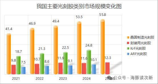总而言之随着先进制程的增长,KrF、ArF、 EUV 光刻胶持续保持高速增长。2025年我国集成电路领域用光刻胶市场规模预计将达72.3亿,其中晶圆制造用市场规模为58.6亿,封装用市场规模为13.7亿。