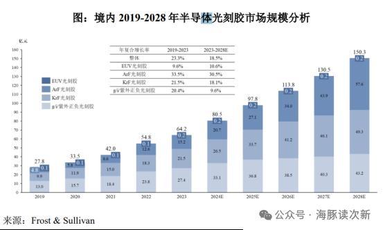预计KrF 光刻胶、 ArF 光刻胶2023-2028年复合增速将分别达18.1%、30.5%,且未来在光刻胶合计占比将从2023年的57%大幅提升至2028年的71%,合计市场规模将从2024年的35亿提升至2028年的超百亿。