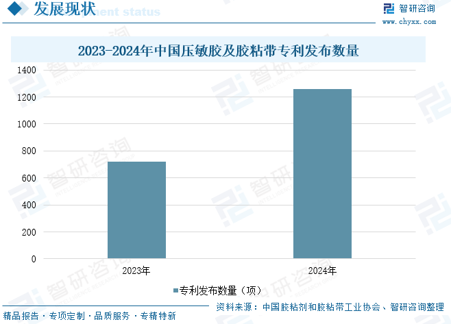 在产业转型及市场竞争加剧的背景下,胶粘带行业内企业不断加大研发力度,致力于细分领域技术创新攻关,以提升企业核心竞争力,促进整个产业更稳更快发展。2024年我国胶粘剂和胶粘带行业共发布专利近3000项,其中,压敏胶及胶粘带专利数量约为1260项,占比42%。