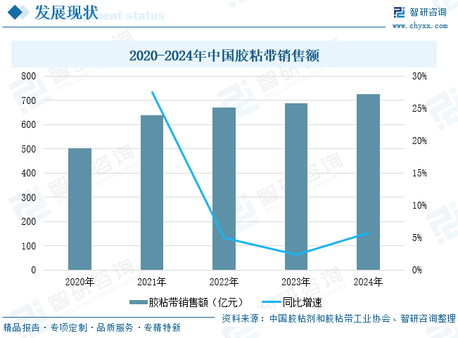 从行业应用来看,胶粘带作为现代工业的重要基础材料,凭借其种类多样、性能可定制化的特点,已深度渗透至民用与工业领域的各个场景,胶粘带销售额不断扩大,2024年中国胶粘带销售额为726.0亿元,同比5.8%,市场运行总体呈现健康向上发展态势,充分体现了行业的市场韧性和发展无限潜力。