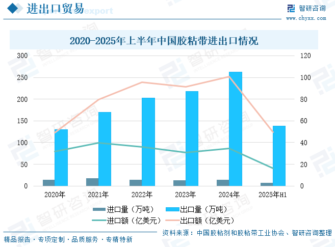 着全球经济的缓慢复苏和我国制造业的快速发展,胶粘带产品的市场需求持续增长。我国拥有完整的产业链和供应链优势,所制备的胶粘带凭借卓越的质量品质、显著的品牌市场影响力及突出的成本优势,加之“双循环”战略驱动,产品畅销国际市场,广受海外市场欢迎。我国已成为全球重要胶粘带出口国,出口数量持续扩大,由2020年的129.49万吨增长至2024年的261.82万吨。2025年上半年,中国胶粘带进口量为7.28万吨,进口额为16.25亿美元,同比分别增长1.39%、2.40%;出口量为137.66万吨,出口额为49.61亿美元,同比分别增长12.14%、1.20%。产品大量销往亚洲周边国家和地区,如越南、印度、印度尼西亚、泰国、菲律宾、韩国等。