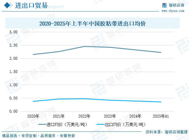 从进出口均价来看,2025年上半年我国胶粘带进出口均价分别为2.23万美元/吨、0.36万美元/吨,进口均价远超出口均价,这也说明我国进口以高端产品为主,出口产品附加值较低,整体竞争力有待进一步提升。