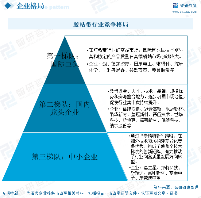 行业内参与企业较多,市场竞争激烈。在胶粘带行业的高端市场,3M、德莎胶带、日东电工、琳得科、综研化学、艾利丹尼森、芬欧蓝泰、罗曼胶带等国际巨头因技术壁垒高和稳定的产品质量在高端领域市场份额较大,福建友谊、冠豪高新、永冠新材等国内企业凭借规模化生产、强大的供应链优势与价格利器,迅速在中低端市场站稳脚跟。随着国内创新型科技企业实力不断提升,研发能力持续增强,在部分领域已经取得了突破性进展。另外,一些中小企业(如惠之星、邦特科技、斯瑞达、富印新材、高泰电子、东莞澳中等)通过“专精特新”策略,在细分技术领域构建差异化竞争优势,构成了覆盖全技术梯度的创新矩阵,有力推动了行业向高质量发展方向转型。