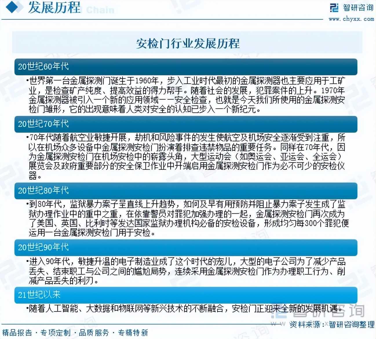 注:本文节选出自智研咨询发布的《2025年中国安检门行业发展历程、产业链、市场规模、重点品牌及未来趋势研判:公共安全需求持续增长,带动安检门规模达21.77亿元[图]》行业分析文章,如需获取行业文章全部内容,可进入智研咨询搜索查看。