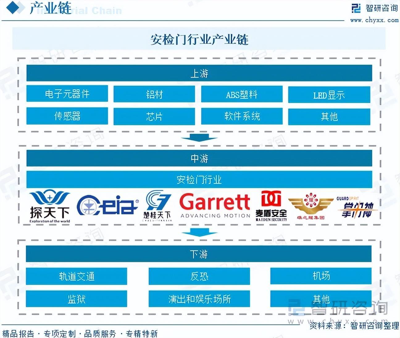 安检门产业链上游为原材料和零部件,包括电子元器件、铝材、ABS塑料、LED显示、传感器、芯片、软件系统等。产业链中游为安检门的生产制造环节。产业链下游为应用领域,主要应用于轨道交通、反恐、机场、监狱、演出和娱乐场所等领域。