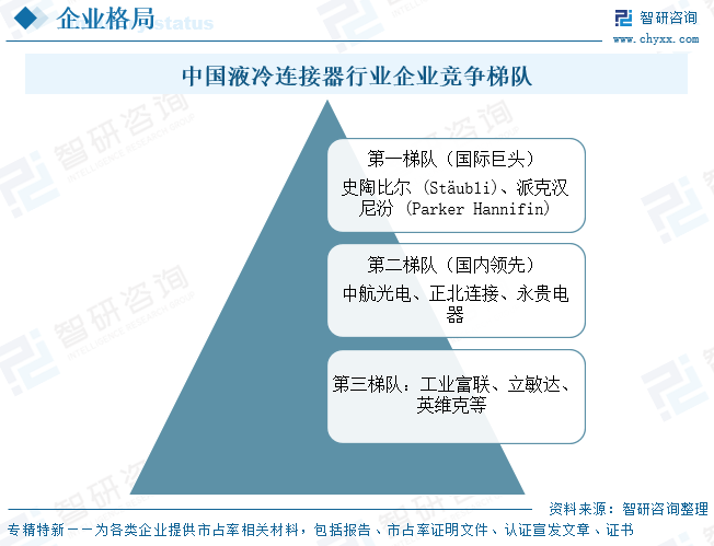 中国液冷连接器市场呈现高度集中的竞争格局,前五大企业合计占据超过70%的市场份额。目前,行业主要分为三个梯队:以瑞士史陶比尔(Staubli)和美国派克(Parker)为代表的第一梯队国际龙头企业,凭借高可靠性密封技术和航空级防泄漏设计主导高端市场,2024年两家企业分别占据约30%和15%的市场份额;第二梯队为中航光电、正北连接、永贵电器等国内领先企业,其中中航光电市占率达15%,其自主UQD专利技术被列入英特尔白皮书,正北连接则以10%的份额提供符合OCP标准的液冷解决方案;第三梯队包括工业富联、立敏达、英维克等企业,主要在中低端市场展开竞争。