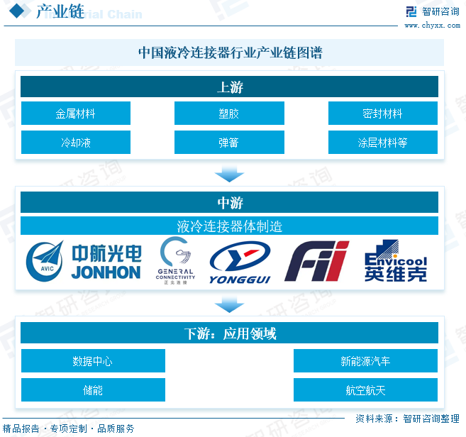 中国液冷连接器行业产业链清晰完整,产业链上游主要为金属、塑胶、密封材料及冷却液等原材料和核心零部件供应,其性能直接决定产品的密封性和寿命;中游是连接器制造环节,国内外企业如史陶比尔、中航光电等聚焦于盲插、快插等产品的精密制造,核心技术在于确保无泄漏和快速插拔;下游广泛应用于数据中心、储能系统、新能源汽车、航空航天等领域,在AI算力爆发和国家“东数西算”政策驱动下,液冷技术正从可选方案变为必选方案,推动全产业链持续升级。