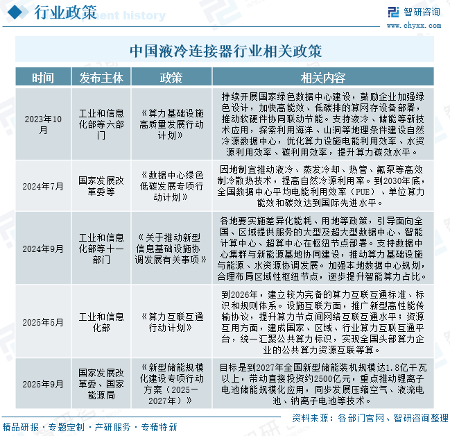 液冷连接器作为高效散热系统的核心部件,其快速发展得益于国家层面多维度政策的系统布局与强力驱动。《算力基础设施高质量发展行动计划》《数据中心绿色低碳发展专项行动计划》《算力互联互通行动计划》等政策共同构建了覆盖算力部署、能效优化与跨域协同的政策体系;《新型储能规模化建设专项行动方案(2025—2027年)》则进一步拓展了其在储能领域的发展空间。这些政策从绿色低碳转型、新型基础设施协同建设到跨领域融合发展,为液冷连接器行业提供了坚实的制度保障与持续增长动力。