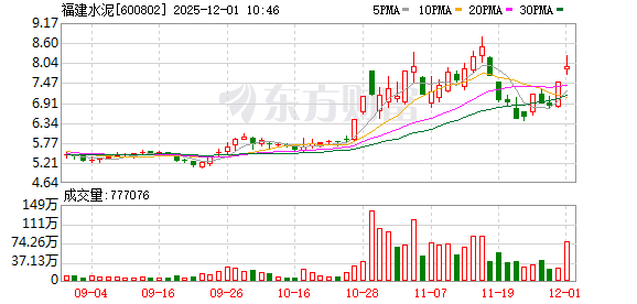 福建水泥再度涨停,5个交易日内录得3个涨停,累计涨幅为26.77%,累计换手率为36.92%。截至9:52,该股今日成交量4579.97万股,成交金额3.65亿元,换手率9.99%。最新A股总市值达37.76亿元。