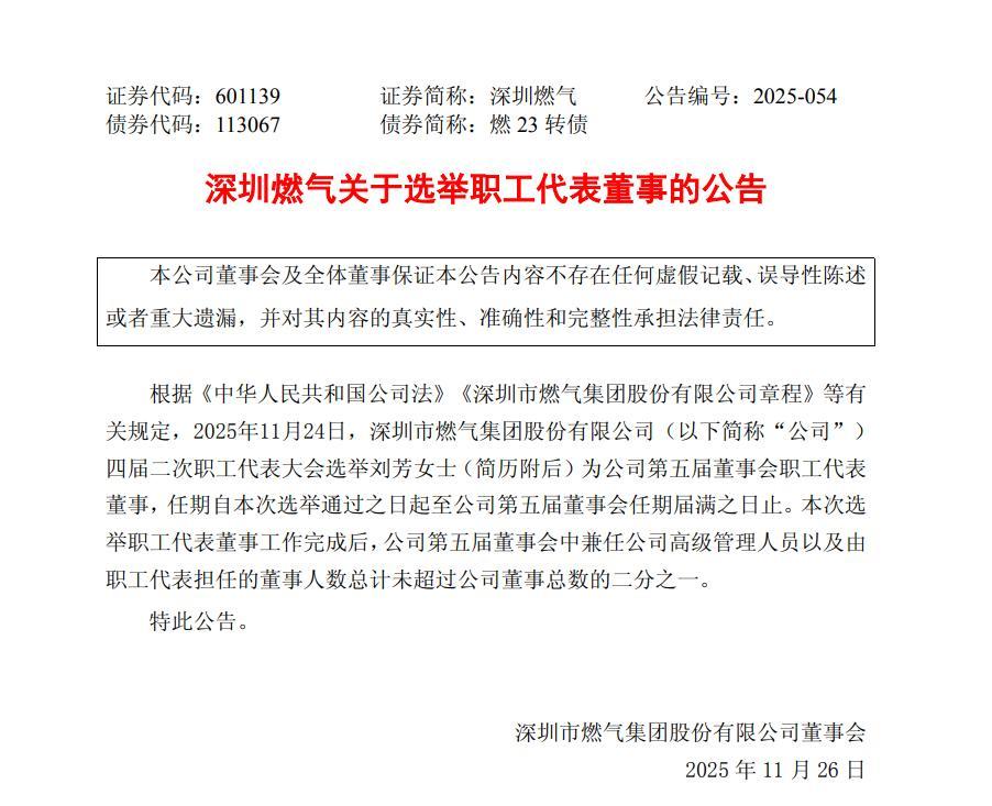 11月25日,深圳燃气(601139)公告称,2025年11月24日,公司第四届二次职工代表大会选举刘芳女士为公司第五届董事会职工代表董事,任期自本次选举通过之日起至公司第五届董事会任期届满之日止。