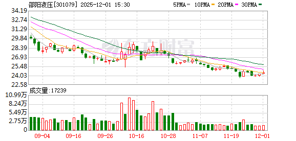 证券时报·数据宝统计,截至发稿,邵阳液压收盘价为24.49元,上涨0.70%,筹码持续集中以来股价累计下跌11.62%。具体到各交易日,18次上涨,18次下跌。
