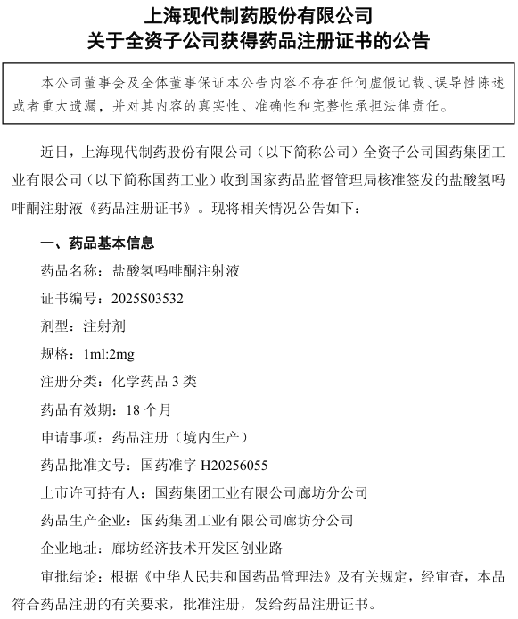 国药现代表示,此次盐酸氢吗啡酮注射液获批上市,标志着公司具备在国内市场生产销售该产品的资格,进一步丰富公司麻醉镇痛板块产品线,有利于进一步增强综合市场竞争力,为公司未来发展带来积极影响。