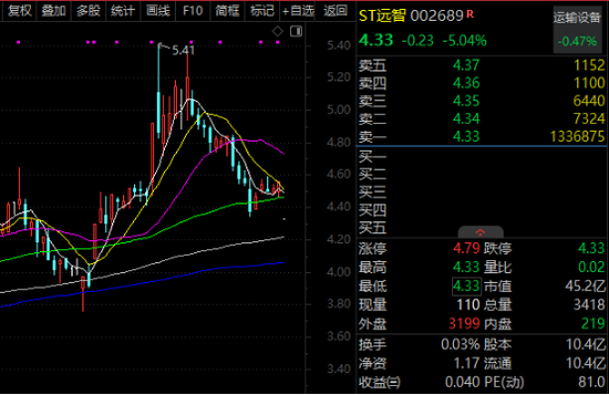 12月2日,ST远智(002689)全天“一”字跌停,收盘报4.33元/股,下跌5.04%,封单超过133万手。