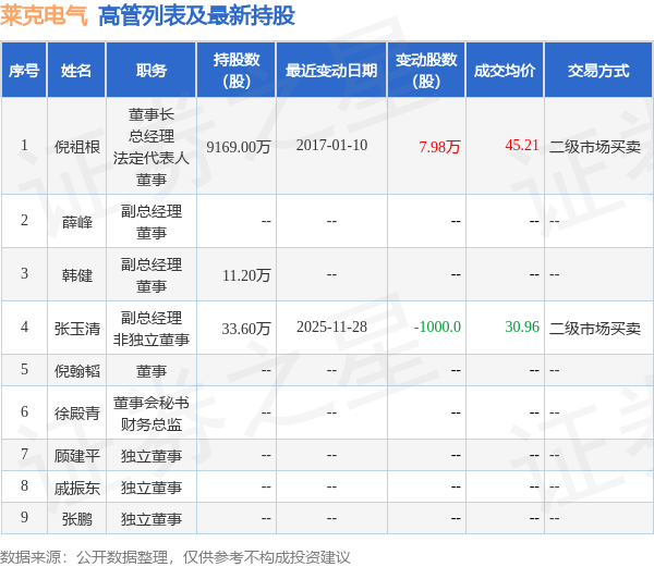 证券之星消息,根据12月2日市场公开信息、上市公司公告及交易所披露数据整理,莱克电气(603355)最新董监高及相关人员股份变动情况:2025年12月1日公司董事张玉清共减持公司股份1000.0股,占公司总股本为0.0002%。变动期间公司股价上涨0.42%,12月1日当日收盘报31.4元。