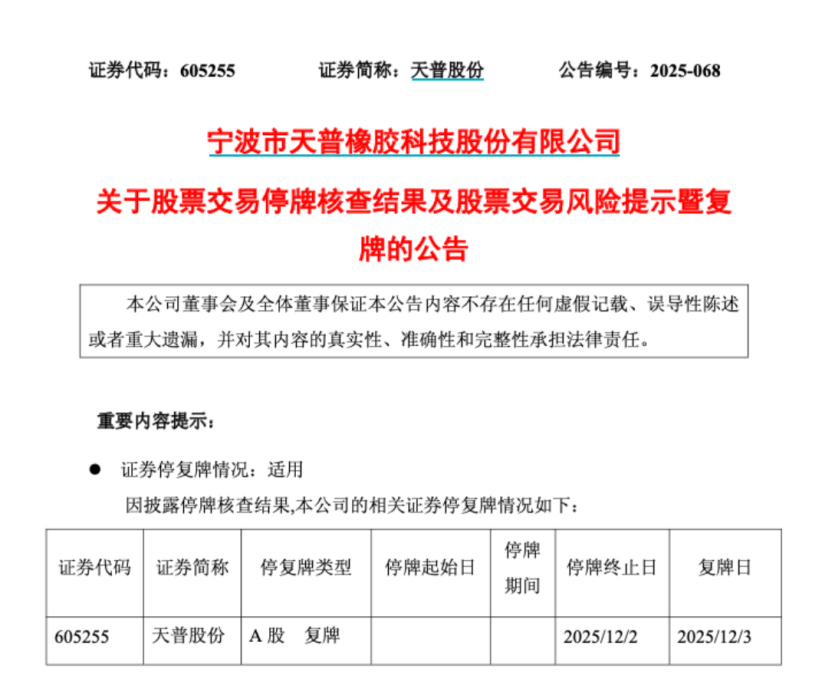 12月2日,天普股份发布公告称,公司就近期股票交易情况进行了核查。鉴于相关核查工作已完成,经申请,公司股票将于12月3日(星期三)复牌。